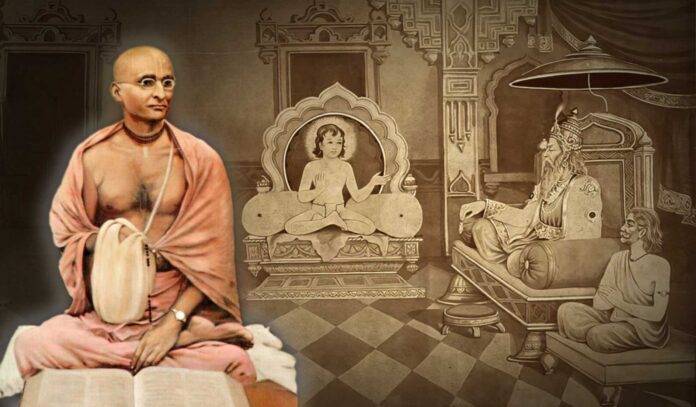 Understanding the inherent nature of humility, devotees do not closely associate with the ignorant in order to try and gain prestige. This is because they are devoid of faults. Instead of encouraging the māyāvādī from Bengal with sweet words and soft statements, Śrī Dāmodara Svārūpa left aside deceitful humility and desired his auspiciousness. *(4) For the welfare of Śrī Vallabha Bhaṭṭa, and to rescue Śrī Kāla Kṛṣṇa Dāsa from the Bhaṭṭathārīs, the Teacher of the supreme truth of tṛṇādapi sunīca has not committed any fault. On the other hand, people with komala-śraddhā and inexperience, being unable to see the intrinsic nature of tṛṇādapi sunīca in a pure Vaiṣṇava, intend to criticise him, considering him to be an enemy. If they conclude that a Vaiṣṇava lacks humility then their komala-śraddhā will be tainted by these faults.