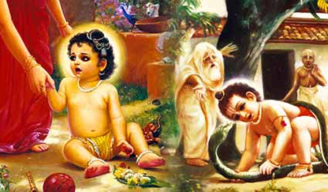 “My dear mother and father,” the Lord said, “it is very good that Viśvarūpa has accepted the sannyāsa order, for thus He has delivered both His father’s family and His mother’s family.” (14) Śrī Caitanya Mahāprabhu assured His parents that He would serve them, and thus the minds of His father and mother were satisfied. (15) One day Śrī Caitanya Mahāprabhu ate betel nuts offered to the Deity, but they acted as an intoxicant, and He fell down on the ground unconscious. (16) After His father and mother sprinkled water on His mouth with great haste, the Lord revived and said something wonderful they had never heard before. (17) The Lord said, “Viśvarūpa took Me away from here, and He requested Me to accept the sannyāsa order. (18)