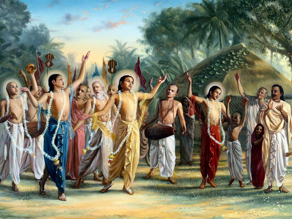 In Śrīmad- Bhāgavatam it is repeatedly and clearly said that the essence of religion in the Age of Kali is the chanting of the holy name of Kṛṣṇa. (50) “O King, in this way people in Dvāpara- yuga worshiped the Lord of the universe. In Kali- yuga they also worship the Supreme Personality of Godhead by the regulations of the revealed scriptures. Kindly now hear of that from me. (51) “In the Age of Kali, intelligent persons perform congregational chanting to worship the incarnation of Godhead who constantly sings the name of Kṛṣṇa. Although His complexion is not blackish, He is Kṛṣṇa Himself. He is accompanied by His associates, servants, weapons and confidential companions.” (52) My dear brothers, please hear all these glories of Lord Caitanya. This verse clearly summarizes His activities and characteristics. (53) The two syllables “kṛṣ- ṇa” are always in His mouth; or, He constantly describes Kṛṣṇa with great pleasure. (54)