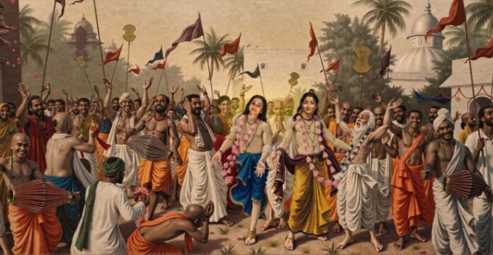 “O my beloved friend Vṛndā, where are you coming from?” “I am coming from the feet of Śrī Hari.” “Where is He?” “In the forest on the bank of Rādhā- kuṇḍa.” “What is He doing there?” “He is learning dancing.” “Who is His master?” “Your image, Rādhā, revealing itself in every tree and creeper in every direction, is roaming like a skillful dancer, making Him dance behind.” (125) “Whatever pleasure I get from tasting My love for Śrīmatī Rādhārāṇī, She tastes ten million times more than Me by Her love. (126) “Just as I am the abode of all mutually contradictory characteristics, so Rādhā’s love is always full of similar contradictions. (127) “Rādhā’s love is all- pervading, leaving no room for expansion. But still it is expanding constantly. (128)