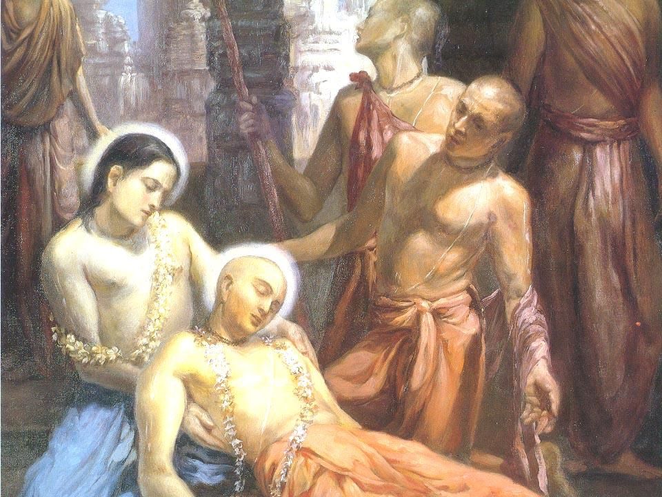 Svarūpa Dāmodara was very anxious, but then he had an idea. The following day, he and the other devotees considered it together. (66) After consulting with one another, they entreated Śrī Caitanya Mahāprabhu to allow Śaṅkara Paṇḍita to lie down in the same room with Him. (67) Thus Śaṅkara Paṇḍita lay at the feet of Śrī Caitanya Mahāprabhu, and the Lord placed His legs upon Śaṅkara’s body. (68) Śaṅkara became celebrated by the name Prabhu- pādopādhāna [“the pillow of Śrī Caitanya Mahāprabhu”]. He was like Vidura, as Śukadeva Gosvāmī previously described him. (69) “When submissive Vidura, the resting place of the legs of Lord Kṛṣṇa, had thus spoken to Maitreya, Maitreya began speaking, his hair standing on end due to the transcendental pleasure of discussing topics concerning Lord Kṛṣṇa.” (70) Śaṅkara massaged the legs of Śrī Caitanya Mahāprabhu, but while massaging he would fall asleep and thus lie down. (71)