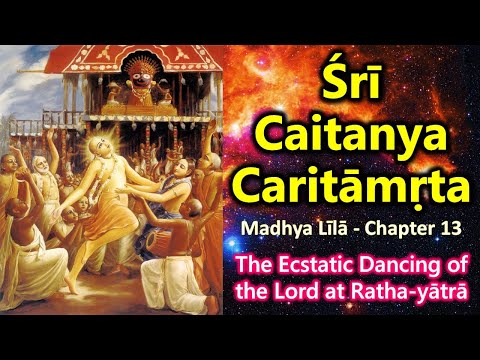 Thus I have described the great performance of congregational chanting by Lord Śrī Caitanya Mahāprabhu as He danced in front of Lord Jagannātha. (205) In his prayer known as the Caitanyāṣṭaka, Śrīla Rūpa Gosvāmī has given a vivid description of the Lord’s dancing before the car of Jagannātha. (206) “Śrī Caitanya Mahāprabhu danced down the main road in great ecstasy before Lord Jagannātha, the master of Nīlācala, who was sitting on His car. Overwhelmed by the transcendental bliss of dancing and surrounded by Vaiṣṇavas who sang the holy names, He manifested waves of ecstatic love of Godhead. When will Śrī Caitanya Mahāprabhu again be visible to my vision?” (207) Anyone who hears this description of the car festival will attain Śrī Caitanya Mahāprabhu. He will also attain the elevated state by which he will have firm conviction in devotional service and love of Godhead. (208) Praying at the lotus feet of Śrī Rūpa and Śrī Raghunātha, always desiring their mercy, I, Kṛṣṇadāsa, narrate Śrī Caitanya- caritāmṛta, following in their footsteps. (209)