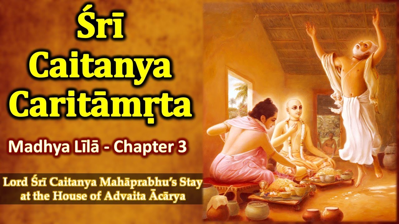 Śrī Advaita Ācārya would say, “Many days You escaped Me by bluffing. Now I have You in My home, and I will keep You bound up.” (117) So speaking, Advaita Ācārya performed congregational chanting with great pleasure for three hours that night and danced all the time. (118) When Advaita Ācārya danced in that way, Lord Caitanya felt ecstatic love for Kṛṣṇa, and because of His separation, the waves and flames of love increased. (119) Being agitated by the ecstasy, Śrī Caitanya Mahāprabhu suddenly fell to the ground. Seeing this, Advaita Ācārya stopped dancing. (120) When Mukunda saw the ecstasy of Śrī Caitanya Mahāprabhu, he understood the feelings of the Lord and began to sing many stanzas augmenting the force of the Lord’s ecstasy. (121) Advaita Ācārya raised the body of Śrī Caitanya Mahāprabhu to help Him dance, but the Lord, after hearing the stanzas sung by Mukunda, could not be held due to His bodily symptoms. (122)
