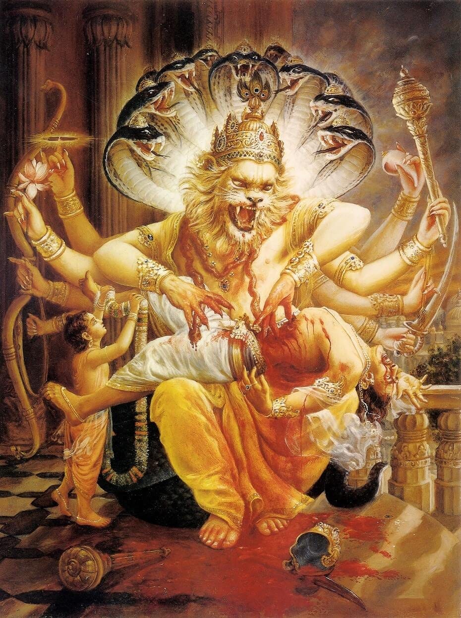 6) To become free from debt I bow down before all-powerful Lord Nrsimha, the master of the goddess of fortune. He blessed Prahlada and ripped apart the demons’ king.