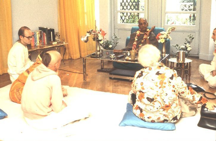 In India I lived in Vṛndāvana, and now I am in America, but this does not mean that I am out of Vṛndāvana, because if I think of Kṛṣṇa always, then I’m always in Vṛndāvana, regardless of the material designation. Kṛṣṇa consciousness means that one always lives with Kṛṣṇa on that spiritual planet, Goloka Vṛndāvana, and that one is simply waiting to give up this material body. Smarati nityaśaḥ means “continuously remembering,” and for one who is continuously remembering Kṛṣṇa, the Lord becomes tasyāhaṁ sulabhaḥ—easily purchased. Kṛṣṇa Himself says that He is easily purchased by this bhakti-yoga process. Then why should we take to any other process? We can chant Hare Kṛṣṇa, Hare Kṛṣṇa, Kṛṣṇa Kṛṣṇa, Hare Hare / Hare Rāma, Hare Rāma, Rāma Rāma, Hare Hare twenty-four hours daily. There are no rules and regulations. One can chant in the street, in the subway, or at his home or office. There is no tax and no expense. So why not take to it?