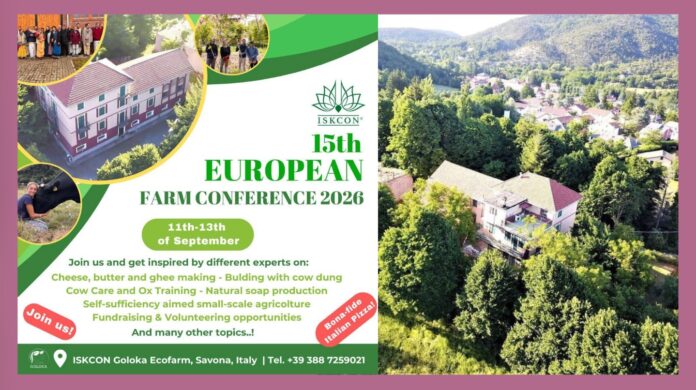 The European Farm Conference 2026 will be held from September 11–13 at the newly established Goloka Ecofarm in Savona, Italy. Organized by ISKCON’s Ministry of Cow Protection and Agriculture, the event will bring together devotees, practitioners, and experts from across Europe for focused engagement in sustainable agriculture and community development.