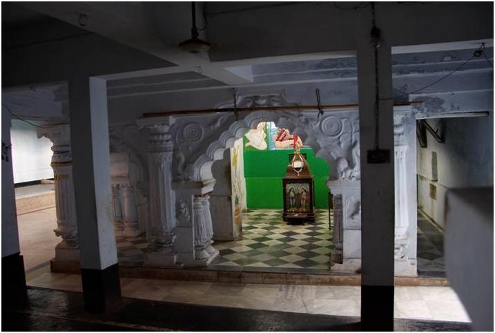 The word gambhira means deep, inscrutable, hidden or secret. Mahaprabhu stayed in Gambhira constantly for last 12 years of His manifest pastimes. During this time He was feeling intense separation from Krishna and was manifesting His viraha-bhava. Room is “deep” inside the house. When Mahaprabhu stayed here the room had mud walls and sunken floor, which has been raised in the course of time. By looking through a small barred window one can see a box holding the kamandalu (clay water pot), paduka (wooden shoes) and a quilt given to Him by Mother Saci. On marble throne there is a Deity of Sri Caitanya Mahaprabhu wrapped with a cloth so that only His beautiful face is visible.