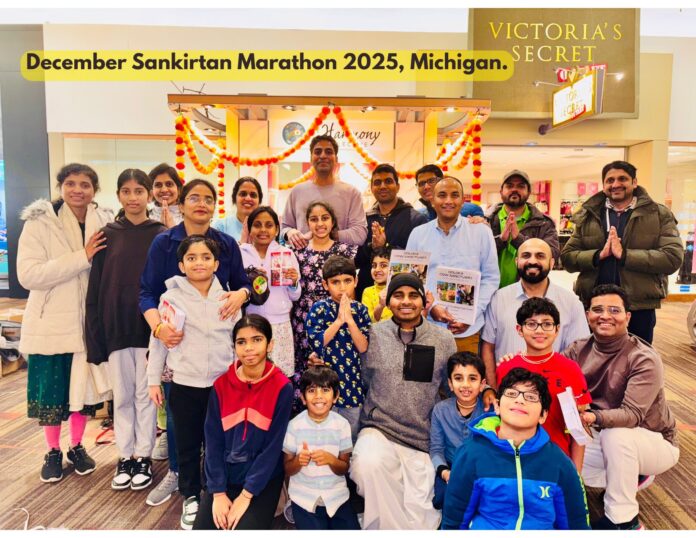 Following the successful Saṅkīrtana Marathon of December 2024, the devotees of Michigan once again undertook a month-long book distribution endeavor in December 2025 at Great Lakes Crossing Mall, one of the largest outlet malls in the state. Amid Michigan’s severe winter, marked by snow and freezing temperatures, the indoor shopping mall provided a practical and uninterrupted venue for continuing saṅkīrtana throughout the season. This time, however, the effort was not conceived as merely another marathon, but as a deliberate challenge—if not double the previous outcome, then certainly more.