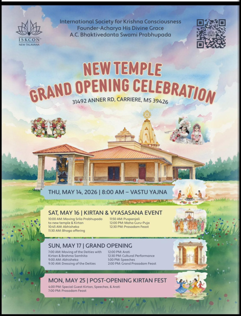 The inauguration of the ISKCON New Talavan temple marks a significant moment in the unfolding of devotional culture rooted in the teachings of A. C. Bhaktivedanta Swami Prabhupada. Situated in rural Mississippi, this sacred endeavor reflects the timeless Vedic principle that spiritual life flourishes in simplicity, harmony with nature, and dedication to Bhagavān.