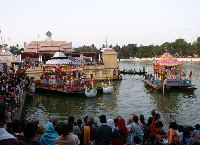 Jagannatha Swami’s Chandan Yatra and Nauka-Lila: Before coming here, Lord Jagannatha’s festive Deity (utsava murti) of Madan Mohana along with His consorts Sridevi and Bhudevi bathe in sandalwood water and are decorated with fragrant flowers. All the Deities travel here on 7 different palanquins. Madan-Mohana, Sri and Bhu-devis arrive in one palanquin; Sri Rama Govinda on a second palanquin; and 5 more palanquins transport the Panca Mahadevas (five Siva linga Deities): Lokanatha, Janesvara, Kapal-mocana, Markandesvara and Nilakanthesvara. Entire length of the procession route from Jagannatha Mandira to Narendra Sarovara is lined with white canopies strewn with forest leaves, flower and fruits. In Narendra-sarovara two nicely decorated boats are used for Chandana-yatra: one boat Sri Madan-Mohana and other boat for Sri Rama Govinda and Panca-Sivas. While the Lords ride in Their boats around the pond, throngs of devotees line the banks chanting Harinam-Sankirtan and relishing most spectacular pastimes of the Lord. After a certain point all the Deities are brought to the temple in the middle of the pond and receive worship from the pujaris. After the festivities the Deities go back to their respective temples in their palanquins.