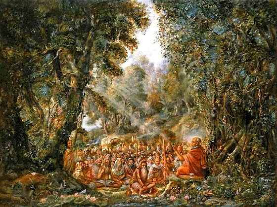 Once, in a holy place in the forest of Naimiṣāraṇya, great sages headed by the sage Śaunaka assembled to perform a great thousand year sacrifice for the satisfaction of the Lord and His devotees.(4) One day, after finishing their morning duties by burning a sacrificial fire and offering a seat of esteem to Śrīla Sūta Gosvāmī, the great sages made inquiries, with great respect, about the following matters.(5)