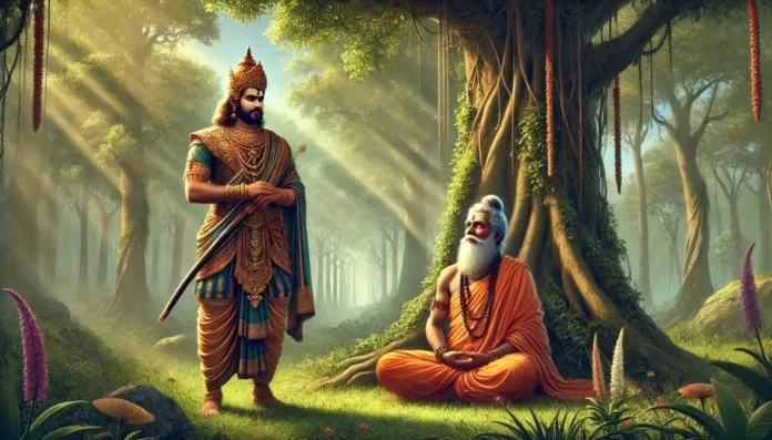 O brāhmaṇas, the circum stances having distressed him with extreme hunger and thirst, the King directed toward the sage his anger and envy, which he had never before directed toward a brāhmaṇa (29).While leaving, the King, being so insulted, picked up a lifeless snake with his bow and angrily placed it on the shoulder of the sage. Then he returned to his palace (30).Upon returning, he began to contemplate and argue within himself whether the sage had actually been in meditation, with senses concentrated and eyes closed, or whether he had just been feigning trance just to avoid receiving a lower kṣatriya (31). The sage had a son who was very powerful, being a brāhmaṇa’s son. While he was playing with inexperienced boys, he heard of his fa ther’s distress, which was occasioned by the King. Then and there the boy spoke as follows (32).