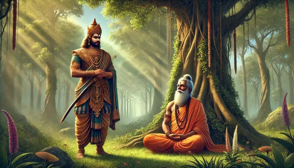 The muni’s sense organs, breath, mind and intelligence were all restrained from material activities, and he was situated in a trance apart from the three [wakefulness, dream and uncon sciousness], having achieved a transcendental position qualitatively equal with the Supreme Absolute (26).The sage, in meditation, was covered by the skin of a stag, and long, com pressed hair was scattered all over him. The King, whose palate was dry from thirst, asked him for water (27).The King, not received by any formal welcome by means of being offered a seat, place, water and sweet addresses, con sidered himself neglected, and so thinking he became angry (28).