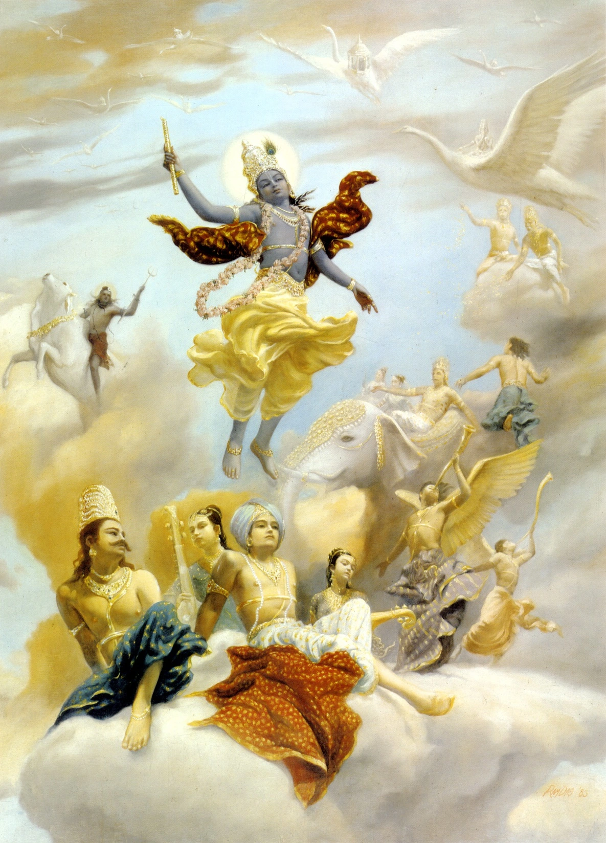 The calves do not suck the teats of the cows, nor do the cows give milk. They are standing, crying, tears in their eyes, and the bulls take no pleasure in the pasturing grounds (19).The Deities seem to be crying in the temple, lamenting and perspir ing. They seem about to leave. All the cities, villages, towns, gardens, mines and hermitages are now devoid of beauty and bereft of all hap piness. I do not know what sort of calamities are now awaiting us (20).I think that all these earthly disturbances indicate some greater loss to the good fortune of the world. The world was fortunate to have been marked with the foot prints of the lotus feet of the Lord. These signs indicate that this will no longer be (21).O Brāhmaṇa Śaunaka, while Mahārāja Yudhiṣṭhira, observing the inauspicious signs on the earth at that time, was thus thinking to himself, Arjuna came back from the city of the Yadus [Dvārakā] (22).