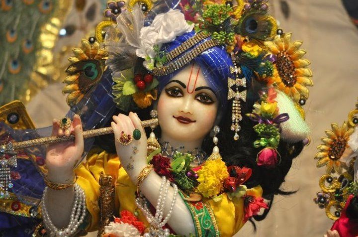 His lotus feet are placed over the whorls of the lotuslike hearts of great mystics. On His chest is the Kaustubha jewel, engraved with a beautiful calf, and there are other jewels on His shoulders. His complete torso is garlanded with fresh flowers (10). He is well decorated with an ornamental wreath about His waist and rings studded with valuable jewels on His fingers. His leglets, His bangles, His oiled hair, curling with a bluish tint, and His beautiful smiling face are all very pleasing (11).The Lord’s mag nanimous pastimes and the glowing glancing of His smiling face are all indications of His ex tensive benedictions. One must therefore con centrate on this transcendental form of the Lord, as long as the mind can be fixed on Him by meditation (12).