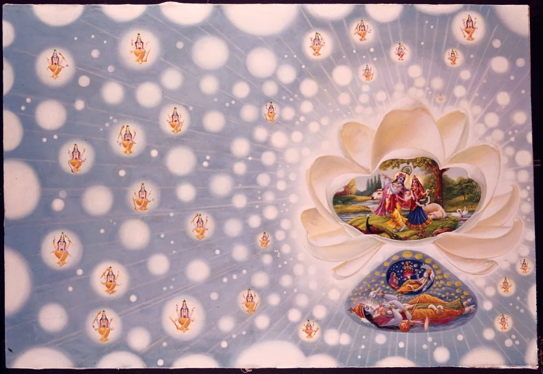 After thus traveling all over the uni verses, they also entered into the spiritual sky, for they were freed from all material contami nation. In the spiritual sky there are spiritual planets known as Vaikuṇṭhas, which are the residence of the Supreme Personality of God head and His pure devotees and are worshiped by the residents of all the material planets (13). In the Vaikuṇṭha planets all the residents are similar in form to the Supreme Personality of Godhead. They all engage in devotional service to the Lord without desires for sense gratifica tion (14).