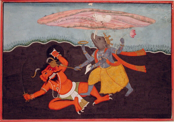 When the demon saw the Per sonality of Godhead, who had eyes just like lo tus petals, standing in position before him, armed with His Sudarśana discus, his senses were overpowered by indignation. He began to hiss like a serpent, and he bit his lip in great resentment (7).The demon, who had fearful tusks, stared at the Personality of Godhead as though to burn Him. Springing into the air, he aimed his mace at the Lord, exclaiming at the same time, “You are slain!” (8) O saintly Vidura, while His enemy looked on, the Lord in His boar form, the enjoyer of all sacrificial offerings, playfully knocked down the mace with His left foot, even as it came upon Him with the force of a tempest (9).