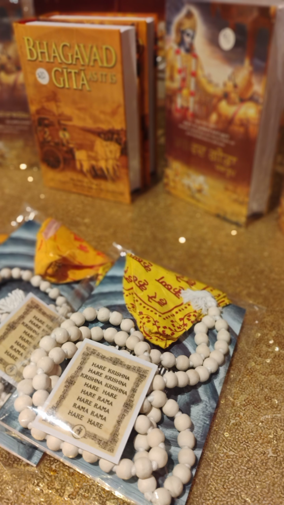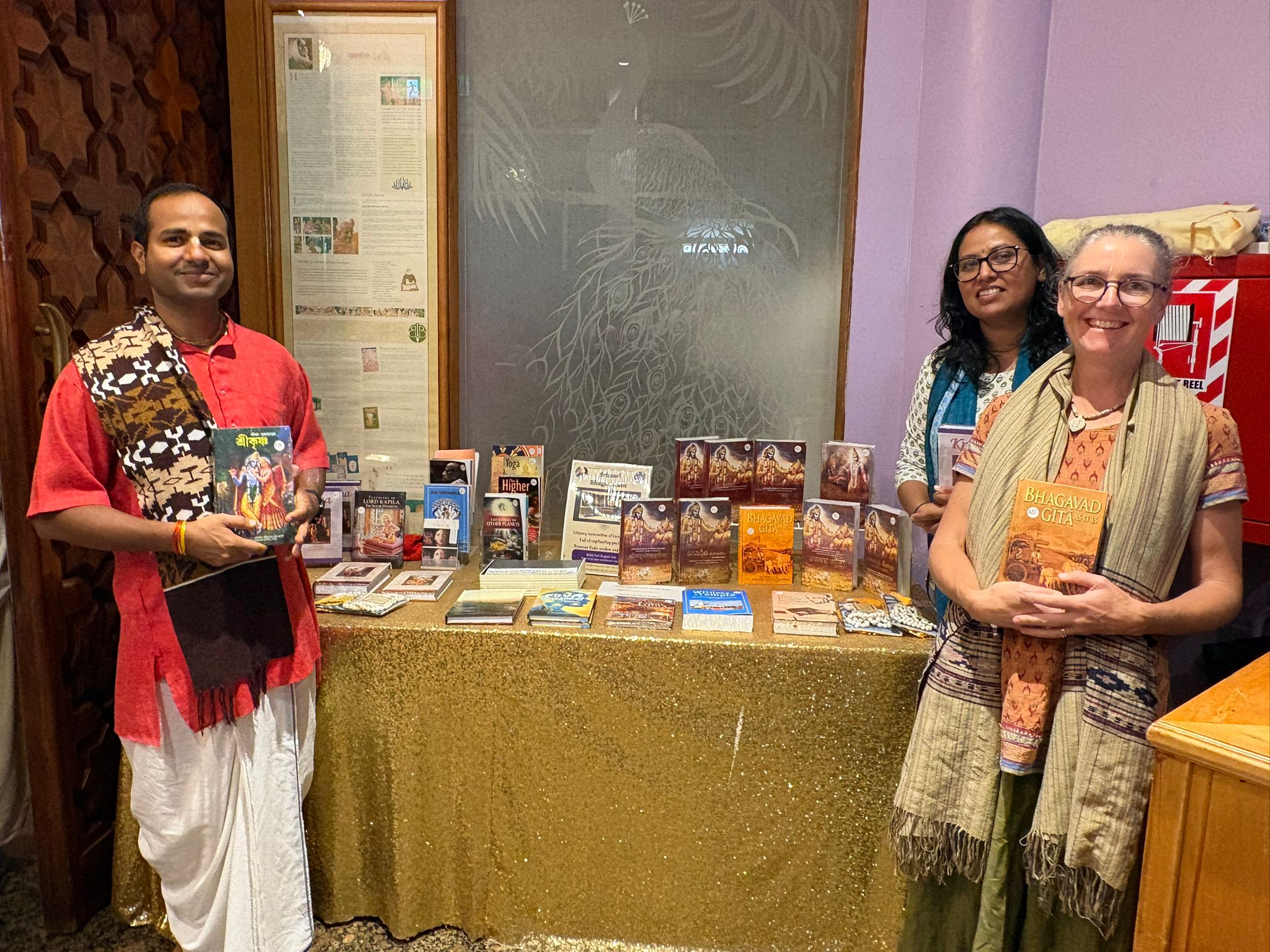 Visitors entering the temple foyer naturally encounter the display. Without pressure or obligation, they browse, reflect, and often choose to purchase books. This voluntary engagement aligns with the principle of free will (svatantrata), a key aspect of spiritual development.