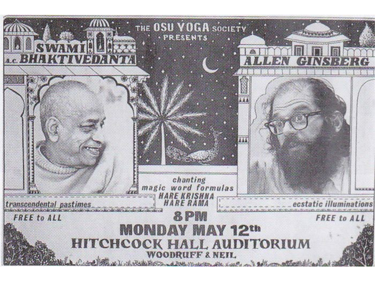 It was true. We put these posters all over the Ohio State University campus. I was in the room when Srila Prabhupada was talking to Sriman Allen Ginsberg before the event. I was shocked, quite honestly, at how humble Srila Prabhupada was, how he was asking Ginsberg’s opinion on the venue. It was amazing. Anyway, about 2,000 midwest teenagers from the “All American City” of Columbus, Ohio showed up, mostly to hear from the bohemian Allen. At this time he was a famous poet. At the event he gave a talk, and I only remember one thing he said. It certainly wasn’t exactly parampara.