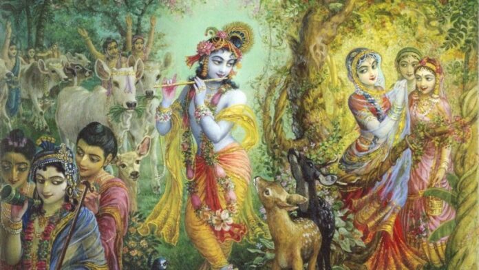 The lakes, rivers and hills of Vṛndāvana resounded with the sounds of maddened bees and flocks of birds moving about the flowering trees. In the company of the cowherd boys and Balarāma, Madhupati [Śrī Kṛṣṇa] entered that forest, and while herding the cows He began to vibrate His flute. (2) When the young ladies in the cowherd village of Vraja heard the song of Kṛṣṇa’s flute, which arouses the influence of Cupid, some of them privately began describ-ing Kṛṣṇa’s qualities to their intimate friends. (3)