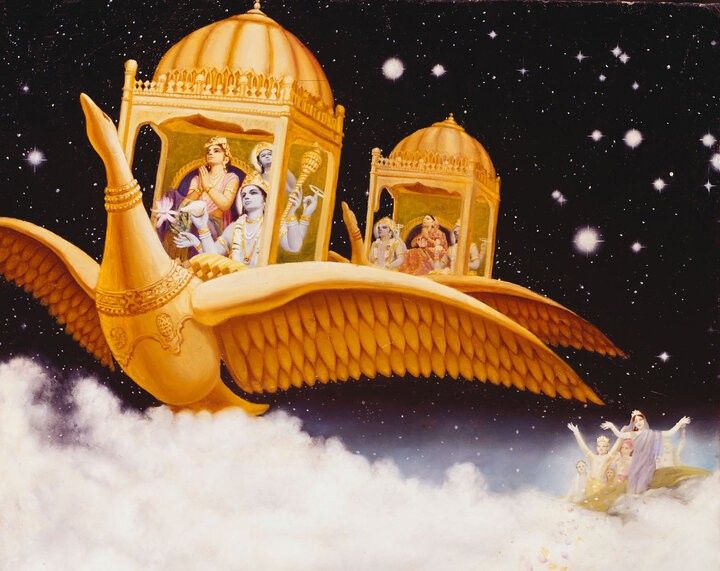 The wives of the demigods continued: Just see how this chaste lady, Arci, by dint of her inconceivable pious activities, is still following her husband upward, as far as we can see (26).In this mate rial world, every human being has a short span of life, but those who are engaged in devotional service go back home, back to Godhead, for they are actually on the path of liberation. For such persons, there is nothing which is not available (27). Any person who engages him self within this material world in performing activities that necessitate great struggle, and who, after obtaining a human form of life which is a chance to attain liberation from mis eries undertakes the difficult tasks of fruitive activities, must be considered to be cheated and envious of his own self (28). The great sage Maitreya continued speaking: My dear Vidura, when the wives of the denizens of heaven were thus talking amongst themselves, Queen Arci reached the planet which her husband, Mahārāja Pṛthu, the topmost self-realized soul, had attained (29).