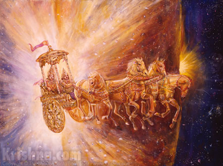 "While so excellently ruling the universe, King Priyavrata once became dissatisfied with the circumambulation of the most powerful sun-god. Encircling Sumeru Hill on his chariot, the sun-god illuminates all the surrounding planetary systems. However, when the sun is on the northern side of the hill, the south receives less light, and when the sun is in the south, the north receives less. King Priyavrata disliked this situation and therefore decided to make daylight in the part of the universe where there was night. He followed the orbit of the sun-god on a brilliant chariot and thus fulfilled his desire. He could perform such wonderful activities because of the power he had achieved by worshiping the Supreme Personality of Godhead."