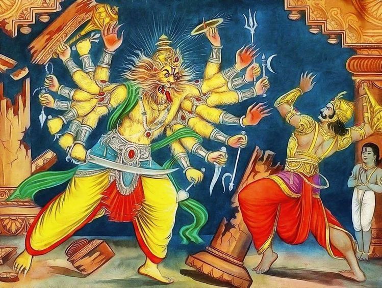 Hiraṇyakaśipu stud ied the form of the Lord, trying to decide who the form of Nṛsiṁhadeva standing before him was. The Lord’s form was extremely fearsome because of His angry eyes, which resembled molten gold; His shining mane, which ex panded the dimensions of His fearful face; His deadly teeth; and His razor-sharp tongue, which moved about like a dueling sword. His ears were erect and motionless, and His nostrils and gaping mouth appeared like caves of a mountain. His jaws parted fearfully, and His entire body touched the sky. His neck was very short and thick, His chest broad, His waist thin, and the hairs on His body as white as the rays of the moon. His arms, which resembled flanks of soldiers, spread in all directions as He killed the demons, rogues and atheists with His conchshell, disc, club, lotus and other natural weapons. (19-22)