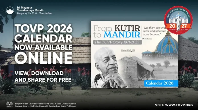The Temple of the Vedic Planetarium has released their free online TOVP 2026 calendar as a viewable, downloadable, and shareable flipbook. This year’s theme is “The TOVP Story 1971-2025, From Kutir to Mandir.”